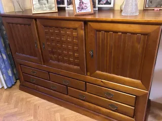 Elegante aparador de salón con un diseño clásico y funcional. - Fabricado en madera de alta calidad. Maciza - Acabado en tono marrón cálido. - Cuenta con puertas y cajones para almacenamiento. - Detalles de diseño en las puertas. Muebles de Manau Medidas 1,80x50,5x111,5