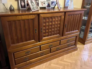 Elegante mueble de comedor con acabados en madera. Cuenta con puertas de cristal y amplios compartimentos. - Diseño clásico y funcional. - Combinación de madera y cristal. - Tiradores dorados. - Amplio espacio de almacenamiento. Se entrega en persona en Viso del Marqués, Ciudad Real.