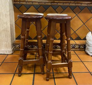 Conjunto de dos taburetes de madera con un acabado marrón oscuro. Son perfectos para una barra o mesa alta. - Diseño clásico y robusto. - Asiento redondo y cómodo. - Patas estables con travesaños.