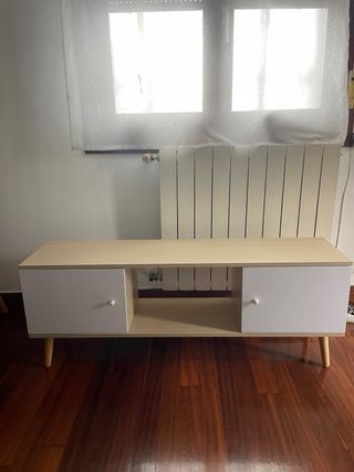 Mesa de televisión con un diseño moderno y funcional, perfecta para organizar tu espacio. - Acabado en madera clara y frentes blancos. - Patas de madera cónicas. - Compartimento abierto y dos cajones con tiradores. En muy buen estado, como nueva. Tiene menos de un año de uso.