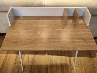Escritorio con un diseño moderno y funcional. - Tablero de madera con acabado natural. - Patas y estructura de metal blanco. - Compartimentos integrados en la parte trasera. - Orificio para gestión de cables.