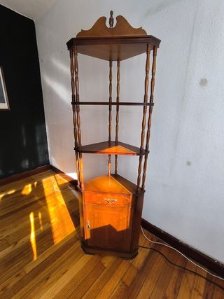 Mueble de esquina con estantes y vitrina. - Estructura de madera con detalles tallados. - Puerta de cristal con divisiones. - Cajones y compartimentos inferiores.