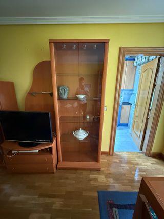 Conjunto de muebles de salón con un diseño elegante y funcional. - Estructura principal de madera. - Mueble con vitrina y compartimentos de almacenamiento. - Incluye espacio para televisión. REGALO DOS MESAS. una de centro más grande y otra algo más pequeña para una esquina o para lo que se quiera. La más grande tiene dos cristales para proteger la madera . La pequeña le falta el cristal