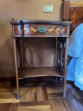 Elegante mesita de noche con un diseño clásico y detalles decorativos. 2 unidades. - Encimera con incrustaciones. - Tirador metálico ornamental. - Estante inferior. - Patas con detalles tallados.