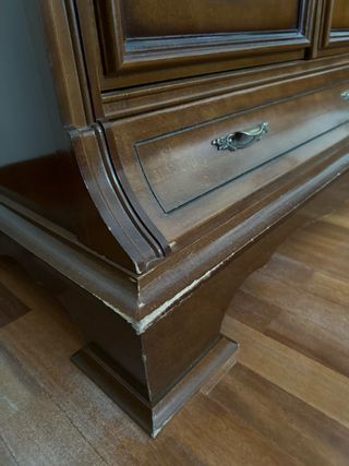 Precioso armario de madera para salón. Está en muy buen estado. - Medidas: 200cm (alto) x 320cm (largo) x 60cm (fondo) (aproximadas) - Tiene una vitrina central, y otra vitrina más a cada lado del armario, estilo clásico. El armario pequeño que se ve en la última foto va incluido, ya que van a juego. Tengo más productos similares a la venta en mi perfil. El precio es negociable.