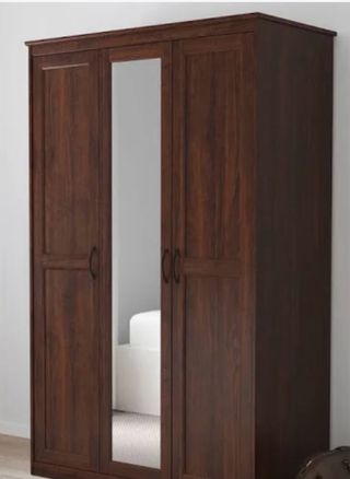 Armario de tres puertas con espejo central. El que yo vendo tiene las puertas lisas - Diseño de madera oscura. - Tiradores metálicos.