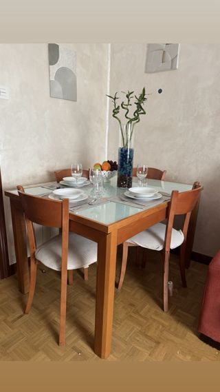 Mesa de comedor extensible de madera maciza + 4 sillas • Material: Madera maciza de alta calidad, resistente y duradera. • Medidas: 1,60 m x 90 cm (extendida hasta 2 m para reuniones grandes). El extensible es del mismo color. • Diseño: Estilo clásico y atemporal, con acabado brillante que resalta la belleza natural de la madera. • Sillas: 4 sillas a juego, con respaldo alto y asiento cómodo. Tapiceria azul marino • Estado: Muy buen estado, como nuevo