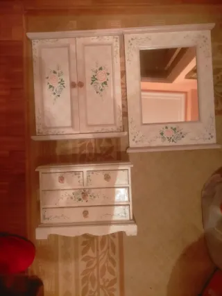 Conjunto de muebles de madera con un diseño floral delicado habría q pintar está por debajo mal mando fotos - Armario con puertas y tiradores. - Espejo con marco decorado. - Cajonera con varios cajones.