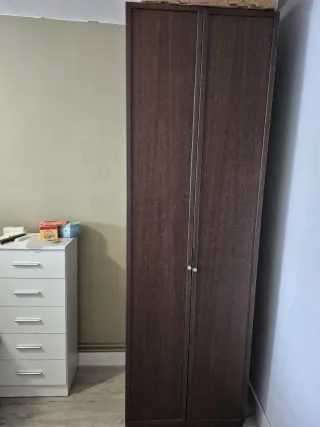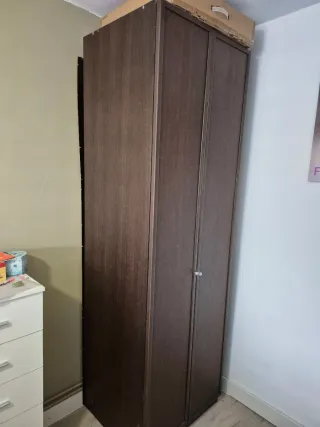 Mueble de dos puertas en acabado wengué. - Diseño moderno y elegante. - Amplio espacio de almacenamiento interior. -Dos barras de colgar -Entrego con dos baldas -Parte de abajo tiene carriles extraibles. *La parte trasera está suelta, hay que clavarle o pegarla. Entrego desmontado.