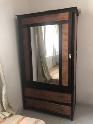 Armario de madera con un diseño rústico y antiguo. Cuenta con un espejo central y puertas abatibles. - Acabado en madera oscura. - Frontal con espejo. - Puerta lateral con espacio para colgar ropa. - Cajón inferior.