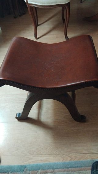 Elegante jamugas con asiento de cuero y estructura de madera. - Diseño curvo y confortable. - Acabado artesanal. Miden de largo 47 y de ancho 35, son de piel y son 2