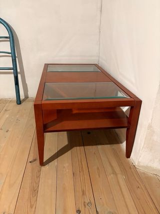 Mesa de centro con superficie de cristal y estructura de madera. Con mecanismo elevable. Abierta mide la mesa 60 cm de alto, sin abrir 45 cm.