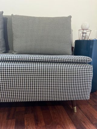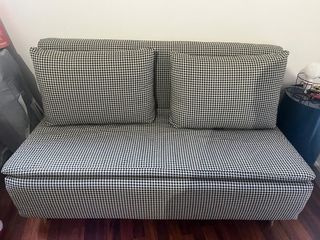 Sofá-cama de dos plazas con un diseño moderno y elegante. - Tapicería con estampado de pata de gallo. - Dos cojines decorativos a juego. - Patas metálicas doradas y patas delanteras plegables que se guardan. - Se vende junto con un colchón de viscoelástico de 12 cm de grosor. - medidas 91 cm profundidad, 150 cm ancho (se hace cama de 140 cm), alto 82 cm, 32 kg peso. - se entrega en mano en el portal, no se envía.
