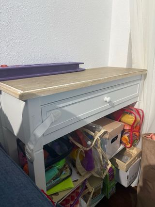 Mueble de entrada con un diseño moderno y funcional. - Acabado superior en madera. - Estructura principal en color blanco. - Cajón con tirador. - Estantes interiores para organización. Retiro este mueble porque no me da para almacenar todos los juguetes de mi hija. Tiene alguna marca además del seguro para niños y el cajón hay que tener cuidado al abrirlo . Si lo quieres tienes que desmontarlo o llevarlo tal cual va anclado a la pared para protección de la bebé.