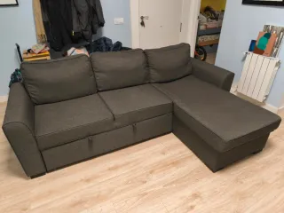 Sofá cama de tres plazas en color gris, ideal para tu salón. Su diseño moderno se adapta a cualquier estilo. - Tapicería de tela. - Chaise longue. - Espacio de almacenaje integrado. En perfecto estado, hay que venir a mí casa a recogerlo, yo lo desmonto y ayudo a bajarlo al transporte URGE VENDER