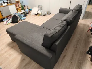 Sofá chaiselongue de color gris, con patas de madera, ideal para pasar robot aspirador. Se vende por cambiar a nuevo. Necesitaría una ligera limpieza. Los cojines están desgastados por el velcro y el asiento del medio algo hundido. De ahí el precio. Ideal para habitación de juegos, sótano, "cama" de visita, etc. Se encuentra en un 8vo con ascensor. Aunque el sofá es ligero, se recomienda que acudan 2 personas a recogerlo.