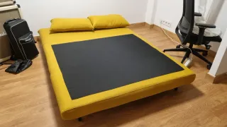 Sofá cama de la marca Maisons du Monde en un llamativo color amarillo mostaza. Su diseño moderno y funcional lo hace perfecto para cualquier espacio. - Tapizado en tela. - Incluye dos cojines decorativos. Se vende porque queremos poner una cama en su lugar.