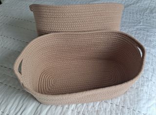 Preciosa cesta de la marca Maisons du Monde. Ideales para organizar cualquier espacio del hogar. - De forma ovalada. - Con asas. - Perfectas para guardar mantas, juguetes, etc. Medidas 38 cm de largo, 16 cm de alto, 28 cm de ancho en la parte superior y 19,5 en la parte inferior. Están como nuevas. Precio unitario 16 €. Se puede hacer precio por las doa juntas, nuevas costaron 26 cada una.