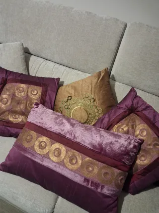 Conjunto de cojines decorativos con un diseño elegante. - Acabado en terciopelo suave. - Detalles bordados en dorado. - Tonos morados y dorados. El marrón cobrizo lo regaló porque le falta alguna arandela, aunque una vez colocado sobre la colcha de la cama no se nota. 40×60,40×40 los dos cuadrados y 45×45 el de regalo