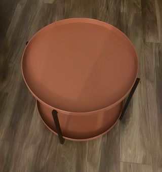 Mesita auxiliar de diseño moderno, color teja con patas negras. Tiene dos alturas que son extraibles. Precio original 80€ - Estructura de metal. - Acabado en color cobre y dorado.