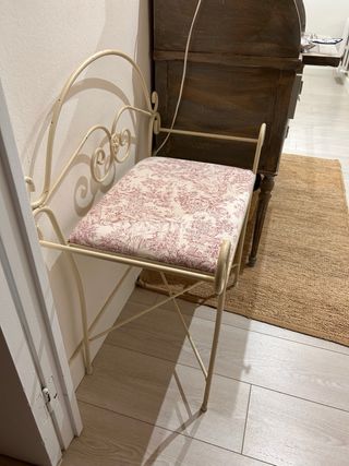 Este banquito de forja añade un toque de encanto a cualquier espacio. Su diseño clásico y el cojín estampado lo hacen destacar. - Estructura de metal resistente. - Cojín con estampado floral en tonos rosas y beige. - Patas cruzadas para mayor estabilidad.