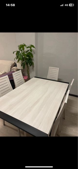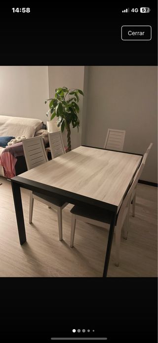 Conjunto de mesa y cuatro sillas. - Diseño moderno con acabado imitación madera. - Patas y estructura de las sillas en color blanco. - Material de gran calidad.