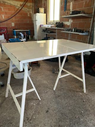 Mesa de escritorio con estantería lateral integrada, todo en uno. Usada para manicura, pero válida también como escritorio, mesa de trabajo o estudio. • Medidas mesa: 120 × 45 × 75 cm • Altura estantería: 160 cm • Color blanco • Estantería con varias baldas • Estructura estable Tiene desgaste estético por uso de productos (ver fotos), no afecta al uso. Se vende por cambio de mobiliario. Ideal para centro de uñas, estética, despacho o habitación juvenil. No disponible hasta finales de Febrero.