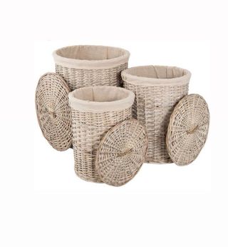Conjunto de tres cestas de mimbre con un forro interior de tela. - Cestas de mimbre tejidas a mano. - Forro interior de tela en color beige. - Incluye tapas a juego. CESTO (3) 0 47 × 56 CM/ 0 38 × 49 CM/ 0 31 x 43 CM