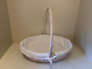Cesta decorativa con un diseño encantador. Altura 35cm Diámetro 27cm Fondo 14cm Puntilla alrededor,se puede descoser y quitar Perfecta utilizado una vez en una boda - Tejido interior de tela. - Asa de mimbre para facilitar su transporte.