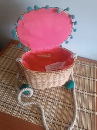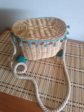 Bonita cesta de mimbre, ideal para los más pequeños. Cuenta con un encantador detalle de pompones. - Adorno de cinta azul con pompones. - Asa de cuerda resistente. Para cualquier duda preguntame sin compromiso.