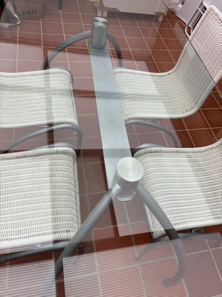 Conjunto de mesa de comedor con sobre de cristal y cuatro sillas. La estructura de la mesa y las sillas es de metal gris, y las sillas tienen asientos de mimbre blanco. Se encuentran en buen estado, aunque presentan algunas señales de uso. - Sobre de cristal transparente. - Estructura metálica gris. - Cuatro sillas con asientos de mimbre blanco.