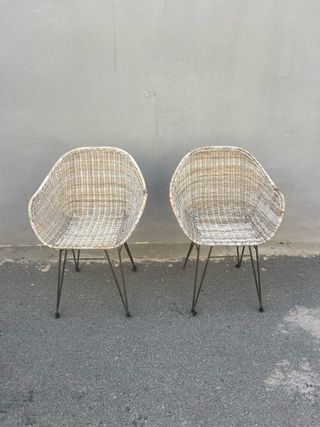 Conjunto de dos sillas de mimbre con un diseño moderno y patas metálicas. - Asientos cómodos y resistentes. - Estilo versátil para cualquier espacio.