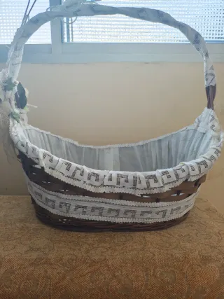 Bonita cesta de mimbre con un delicado acabado. Solo se usó en dos ocasiones para decorar pero de estar guardada tanto se le ha ido estropeando las flores que tenía. Se le puede añadir otras flores o lazos. - Decorada con encaje blanco. - Asa cubierta con tela y encaje.