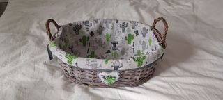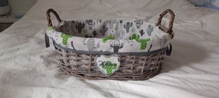 Bonita cesta de mimbre, con tela decorativa de cactus. Medidas: 40x30x15 cm