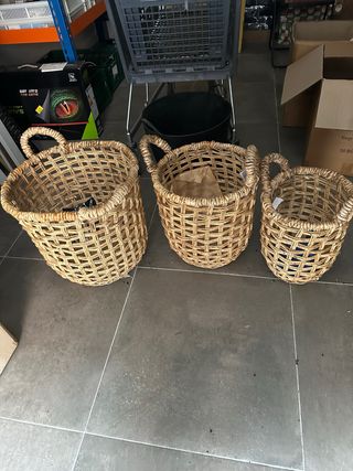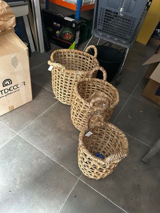 Conjunto de cestas de mimbre y ratán, perfectas para organizar o decorar. Pack 4: 15 euros Unidad: 5 euros Medida 24 largo x 28 ancho x 13 alto - Diseño tejido artesanal. - Tonos naturales que combinan con cualquier estilo.