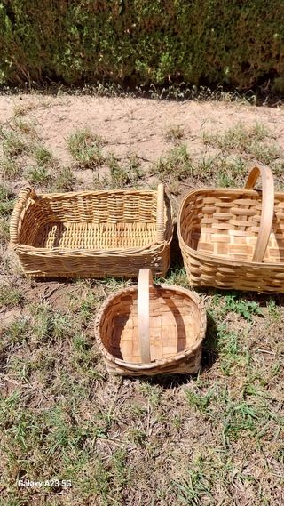 Tres cestas de mimbre antiguas, en buen estado. Ideales para decoración o almacenaje. - Son tres cestas de diferentes tamaños y formas. - Hechas a mano. - Material: mimbre.