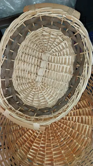 Conjunto de cestas de diferentes tamaños y estilos, perfectas para organizar o decorar. Todas por 4€ - Cesta grande con forro de tela marrón. - Dos cestas ovaladas de mimbre. - Una cesta rectangular de mimbre. - Una cesta redonda pequeña de mimbre.