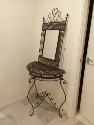 Elegante recibidor de estilo Vintage con detalles ornamentales. - Estructura principal de hierro forjado. - Superficie superior de madera con acabado en mimbre.