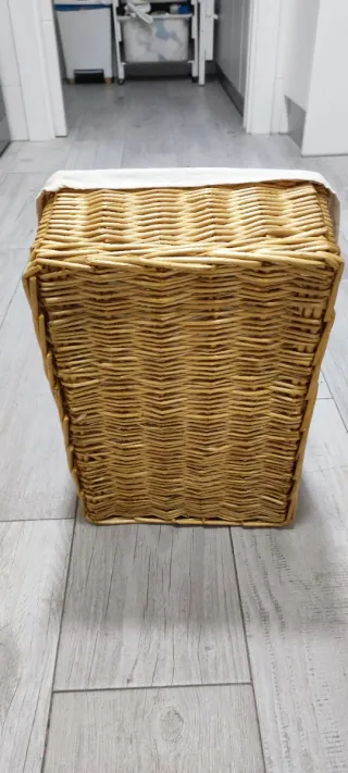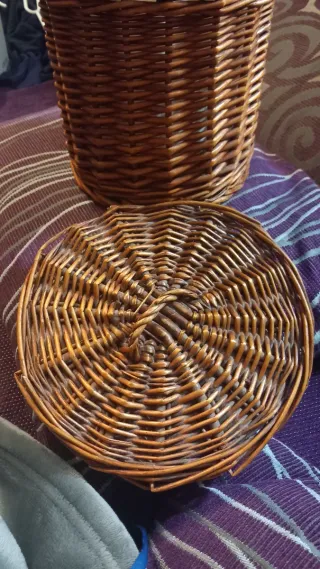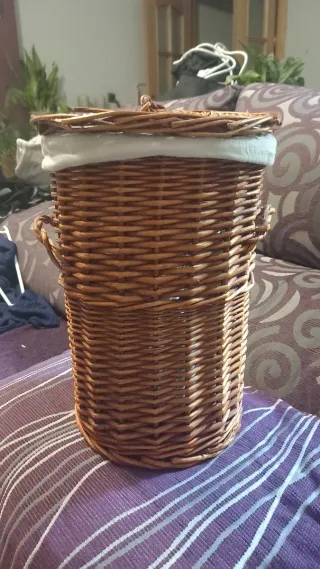 Tengo 2 cestos de mimbre, 7perfectos para organizar la ropa. Uno con tapa y otro sin ella El de sin tapa de 40 cm de diámetro y 60 cm de alto. El de con tapa de 35 cm de diámetro y 65 cm de alto - Diseño cilíndrico y espacioso. - Acabado natural en tonos beige y marrón. - Borde superior trenzado decorativo. Precio unidad 20 € Precio de ambos 30