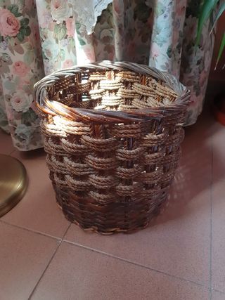 Preciosa cesta de mimbre y ratán, ideal para decoración o almacenaje. Es de color marrón y tiene un asa para facilitar su transporte. Es muy robusta. - Perfecta para plantas, fruta u otros objetos. - Diseño elegante y rústico. - En muy buen estado.