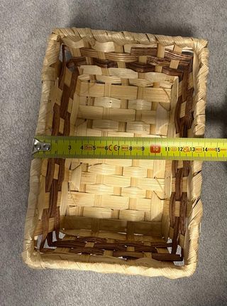 3 cestas pequeñas y medianas de mimbre. De diferentes tamaños, como se ve en las fotos. También se pueden vender por separado a 3€ cada una - Cesta rectangular con diseño entretejido. - Cesta redonda con patrón abierto. - Cesta ovalada con tejido denso.