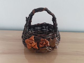 Elegante y bonita cesta pequeña, perfecta como detalle decorativo. - Elaborada con mimbre y madera. - Adornada con dos flores y hojas en tono marrón. En perfecto estado, muy decorativa, ideal para cualquier espacio especial. Las medidas se encuentran en las fotos.