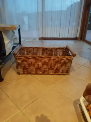 Cesta de mimbre de gran tamaño, ideal para almacenamiento o decoración. - Diseño tejido a mano. - Asas de madera para facilitar el transporte. -Tengo 5 cestas. En principio se venden X separado. -Pago en efectivo