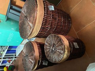 lote de 3 cestos de mimbre con tapa. estan totalmente nuevos lo unico que uno tiene un piquete como se puede ver en la foto.