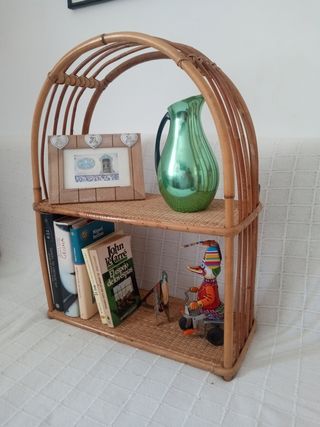 Bonita estantería de mimbre y caña de los años 70 en perfecto estado. Se puede colgar. Medidas: ancho 46, alto 58 y fondo 19. Torremolinos centro. También envío