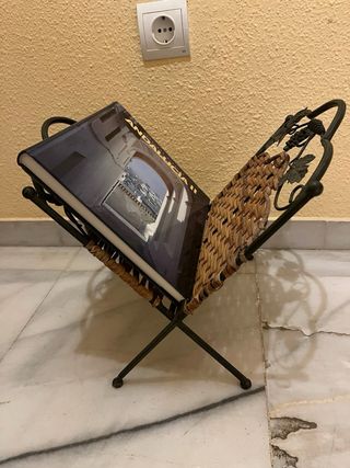 Elegante revistero con estructura de hierro y detalles en mimbre. Su diseño aporta un toque rústico y sofisticado a cualquier espacio. - Asa superior para facilitar su transporte. - Patas curvas para mayor estabilidad. - Diseño ornamental en el frontal.