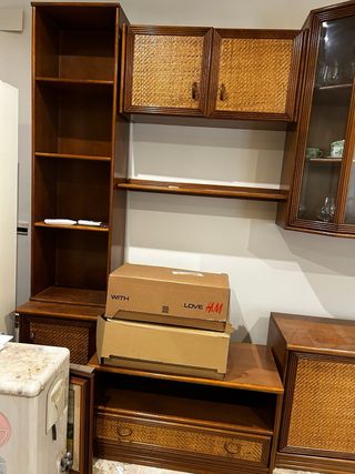Conjunto de muebles de salón modulares con un diseño elegante y funcional. - Fabricado en madera maciza. - Detalles en mimbre. - Puertas de cristal en vitrina. - Acabado en tonos beige y marrón.