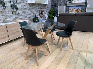Diseño sencillo y elegante, ideal para comedor, cocina u oficina. Perfecta para disfrutar del día a día con estilo y comodidad. medida de la mesa : 120x75 cm Características: -``Mesa de cristal templado, resistente y duradera -``Patas de acero con efecto madera, modernas y estables -``Sillas estilo nórdico incluidas: elegantes, cómodas y versátiles -``Estructura de polipropileno con base de madera en las sillas -``Fácil montaje – Envío a domicilio (consultar tarifa) – Pago contra reembolso – Garantía de 3 años Ref: DT-602 + 4 DANESA