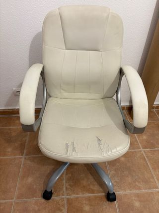 Silla de escritorio en color blanco, con un diseño ergonómico y base giratoria. Presenta desgaste visible en la zona del asiento (ver en fotos), pero la estructura, ruedas y frenos funcionan correctamente. - Tapicería de polipiel. - Brazos acolchados. - Base con ruedas para fácil movilidad. 📩 Si quieres más fotos o información escríbeme.