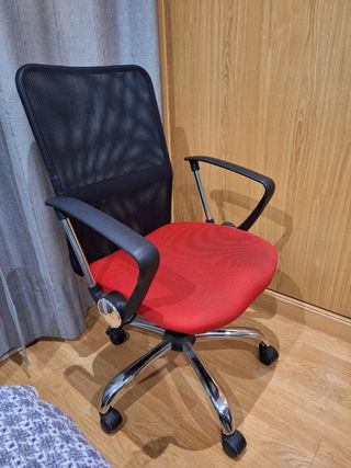 Preciosa silla de escritorio, ideal para trabajar cómodamente desde casa u oficina. Es giratoria y tiene ruedas para facilitar el movimiento. - Respaldo de malla negra. - Asiento rojo de tejido. - Estructura metálica cromada.